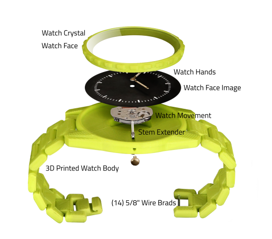 The cuts of the watch are genuine watch pieces which needed to be ordered. The band and watch body were 3D printed in PLA on my Monoprice Maker Select 3D printer.